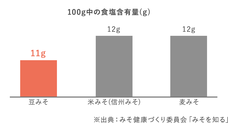 ★豆みそは色が濃いことや、旨みが強く味が濃く感じることから、塩分が高めだと思われがちですが、他のみそに比べ、塩分は低めです。また、みその塩分は、同じ塩分量の食塩水よりも吸収されにくいことがわかっています。