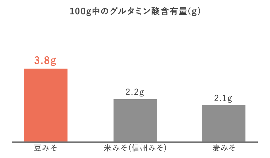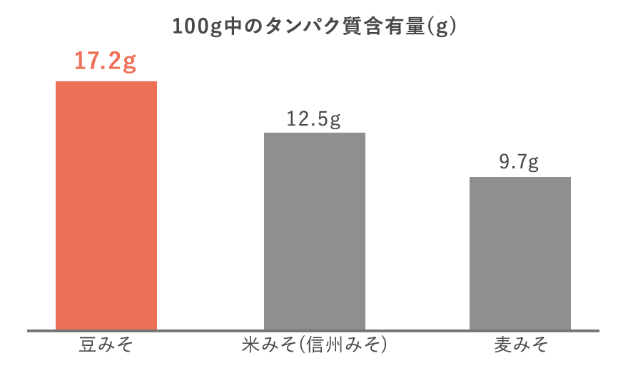 豆みそは他のみそに比べ、原料に占める「大豆」の割合が大きいため、たんぱく質や旨み成分(グルタミン酸)を多く含みます。