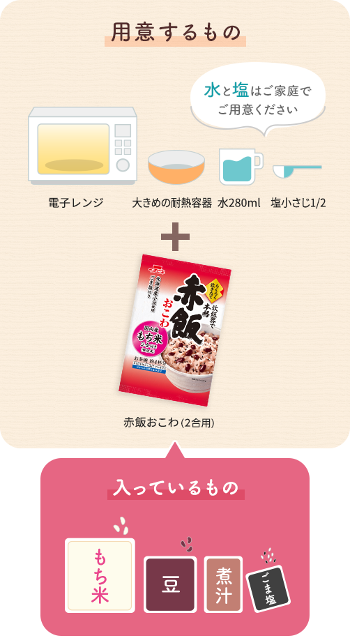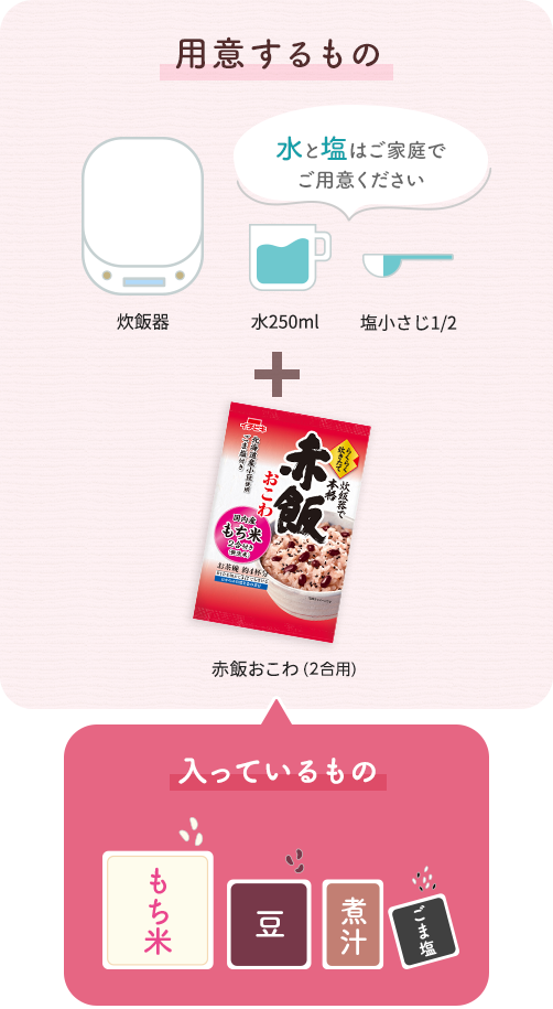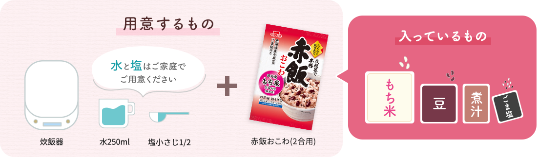 あとは水と塩を加えるだけで手軽においしい赤飯を炊くことができます。
