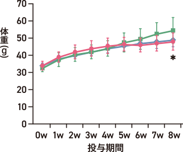 ICR雄性マウスに、Ⅰ群:通常食、Ⅱ群:高脂肪食(ラード15%添加)、Ⅲ群:高脂肪食+蔵華乳酸菌を摂取させ、体重の変化を調査しました。