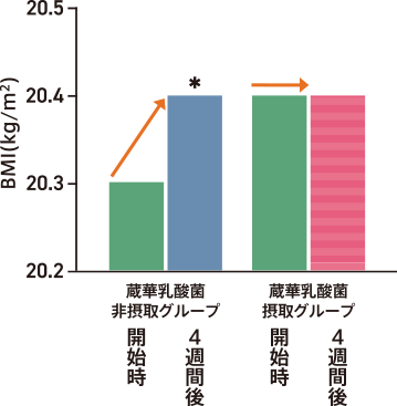 被験者の2週間毎のBMIの経時変化を比較しました。その結果、蔵華乳酸菌を摂取していないグループのBMIは摂取前2週間と比較して有意に増加しましたが、蔵華乳酸菌を摂取しているグループのBMIは摂取前2週間と比較して有意な差がありませんでした。