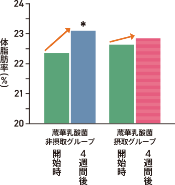 被験者の2週間毎の体脂肪率の経時変化を比較しました。その結果、蔵華乳酸菌を摂取していないグループの体脂肪率は摂取前2週間と比較して有意に増加しましたが、蔵華乳酸菌を摂取しているグループの体脂肪率は摂取前2週間と比較して有意な差がありませんでした。