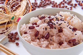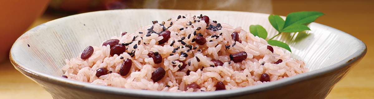 小豆やささげ豆の色がゆで汁に移り、それがもち米に吸収されるため、赤色を帯びた色になるのが特徴です。おにぎりやお弁当として普段の食事に取り入れられることも多く、コンビニでも赤飯おにぎりは定番商品となっています。小豆の煮汁には体に嬉しい栄養成分が含まれるので、煮汁をしっかりもち米に吸収させて炊く赤飯は、小豆の栄養成分を余すことなく摂取できます。