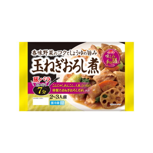 ●特製たまねぎおろしだれ付きなので、豚バラ肉を加えるだけで、さっぱりコク旨な玉ねぎおろし煮が7分で作れます。