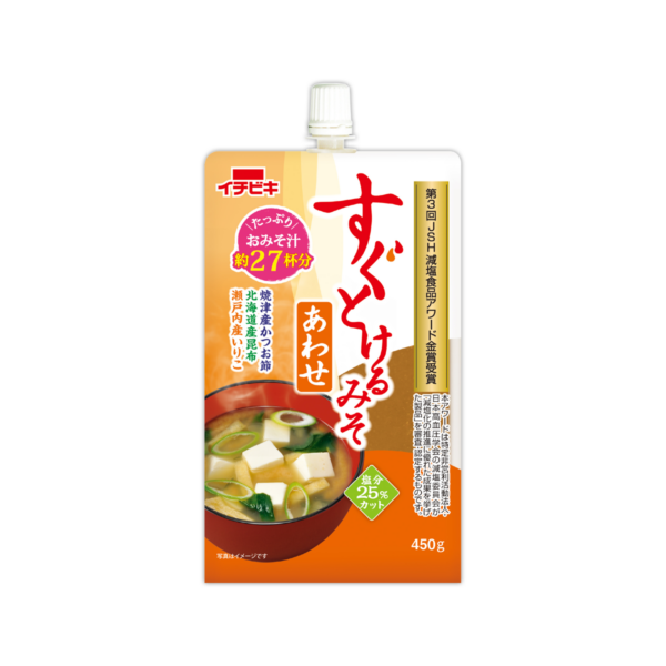 - 独自製法で旨み成分をたっぷり含んだ減塩タイプの豆みそに、まろやかな米みそと、焼津産かつお節、北海道産昆布、瀬戸内産いりこをブレンドすることで、減塩しながら濃厚でおいしく仕上げました。