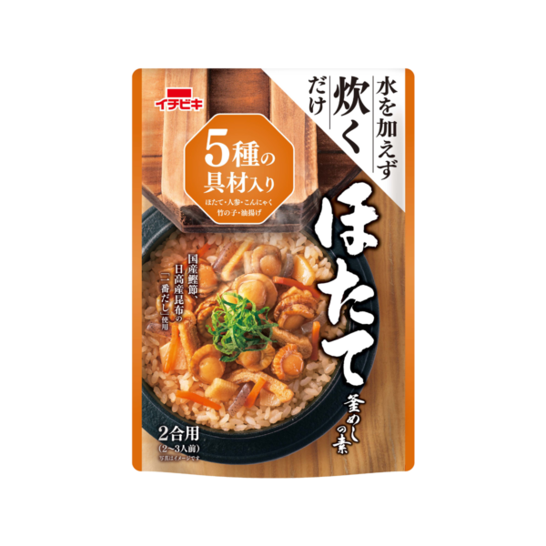 ほたて(国産)、人参、こんにゃく、ぶどう糖果糖液糖、竹の子、油揚げ、食塩、しょうゆ、たん白加水分解物、植物油、米発酵調味料、ほたてエキス、バター加工品、鰹節、酵母エキス、昆布/調味料(アミノ酸等)、香料、水酸化Ca(こんにゃく用凝固剤)、豆腐用凝固剤、酸味料、(一部に小麦・乳成分・大豆を含む)