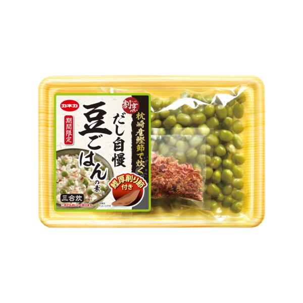 ●鰹厚削り節を炊飯器にそのまま入れて炊き上げる、豊かなだしの香りが自慢の豆ごはんの素です。