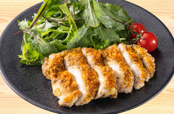 ●自社特製の塩糀に香味野菜と黒こしょうを合わせ、ごはんに合う味付けに仕上げました。