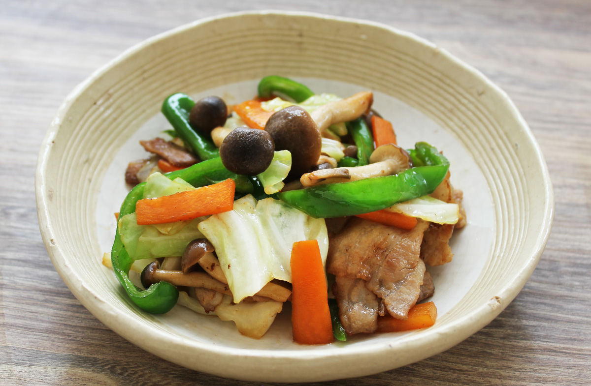 豚肉は一口大、キャベツはザク切り、にんじんは短冊切り、ピーマンは細切り、しめじは石づきを除き小房に分ける。
