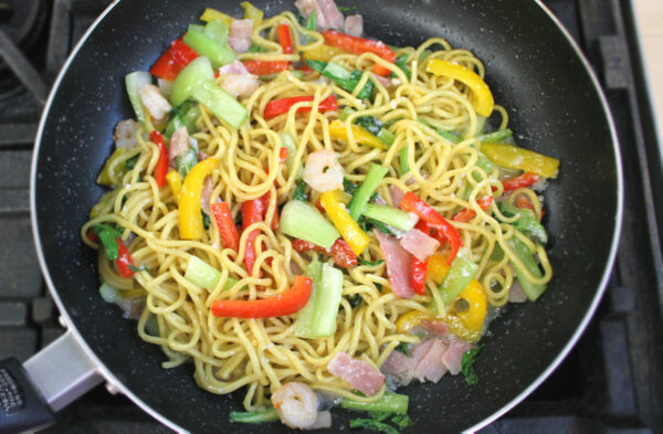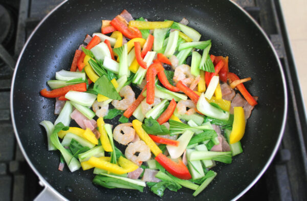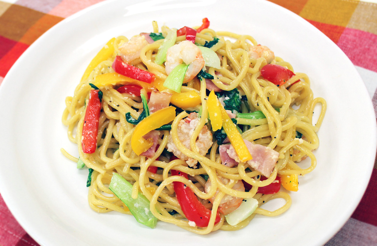 (2)にほぐした麺を加えて炒め合わせ、黒こしょうで味を調える。