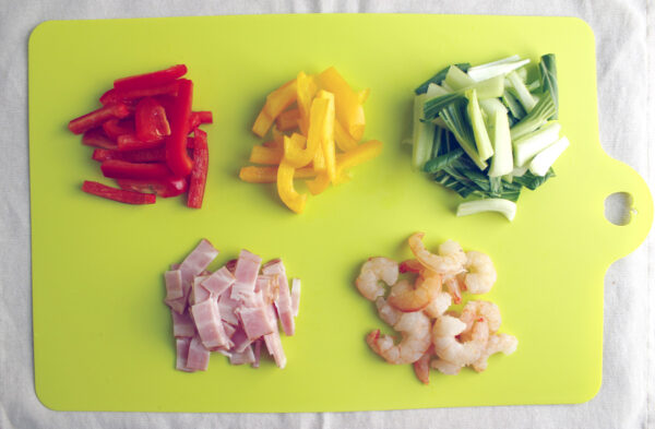 チンゲン菜、パプリカ、ベーコンは食べやすい大きさに切る。