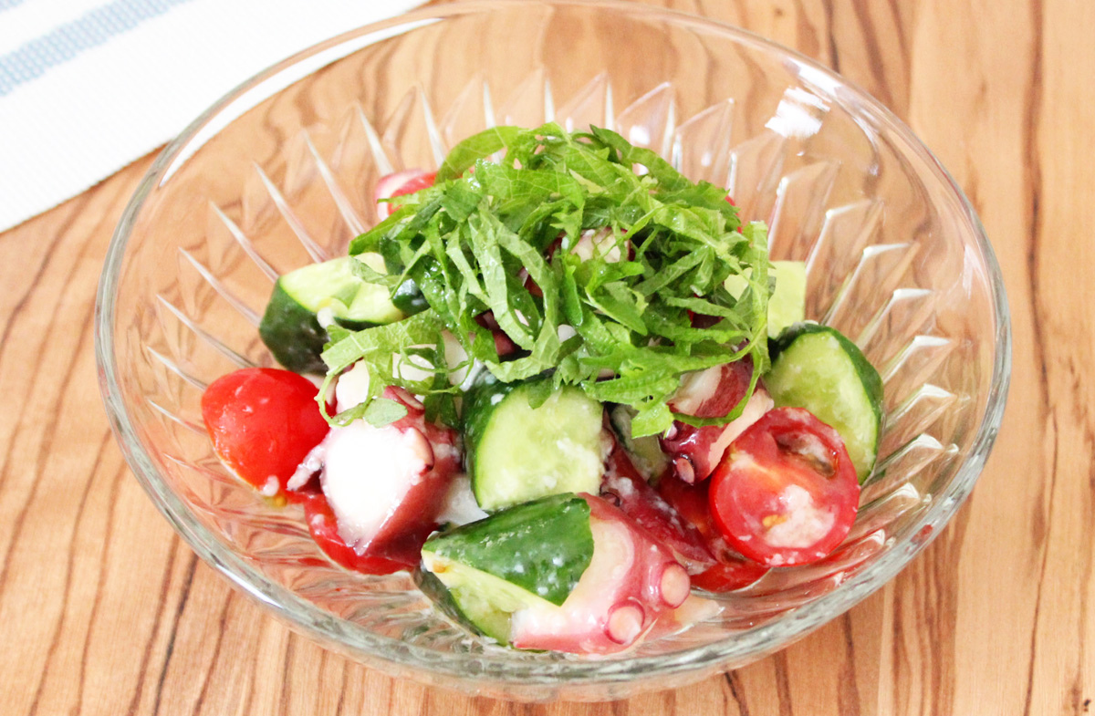 タコ、きゅうりは乱切り、ミニトマトは半割り、大葉は千切りにする。