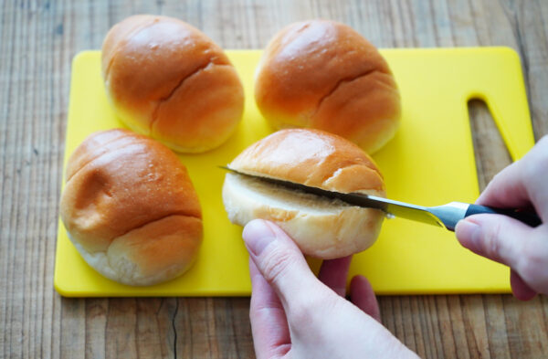 ロールパンは長い方に2/3程度まで切り込みを入れる。