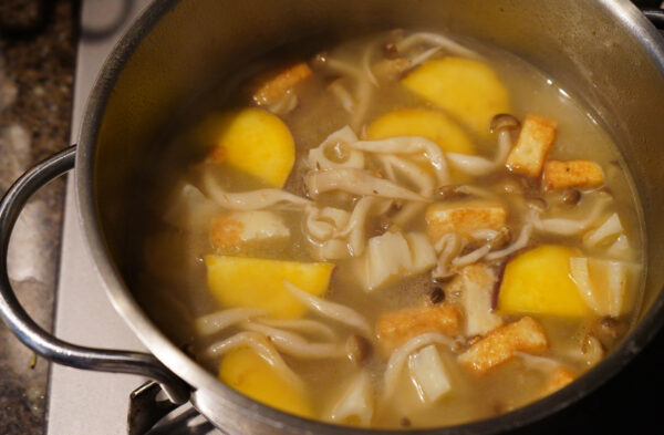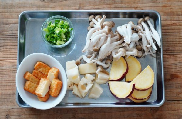 厚揚げは食べやすい大きさに切る。さつまいもは幅5mm程度の半月切り、れんこんは小さめの乱切りにする。しめじは根元を切って小房に分ける。