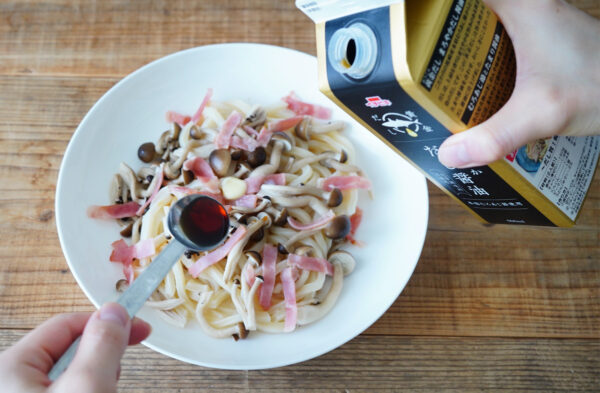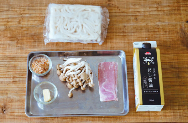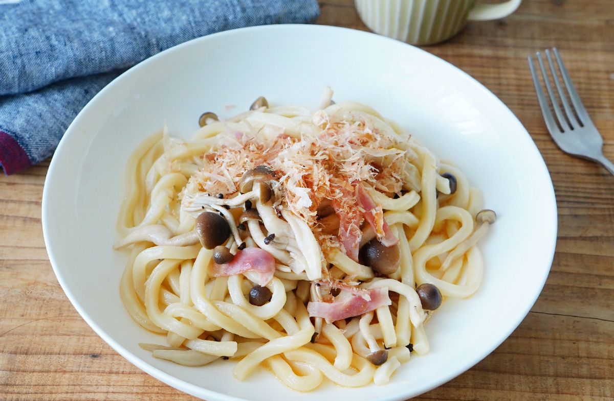 レンジで完結♪国産だし醤油で!しめじとベーコンのバター醤油うどん