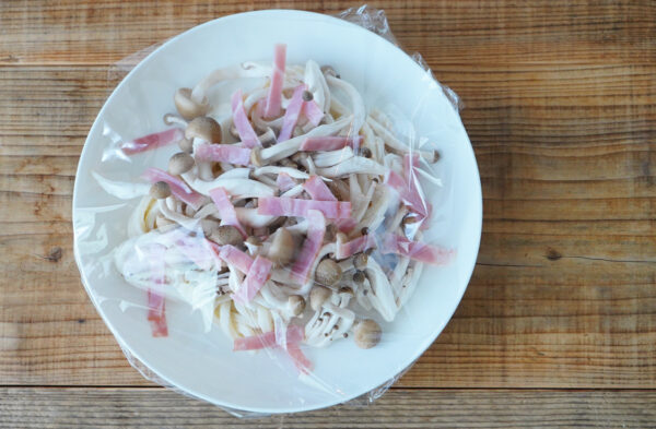 耐熱容器に冷凍うどん、しめじ、ベーコンを入れ、ふんわりラップをかけ電子レンジ(600W)で3分半加熱する。