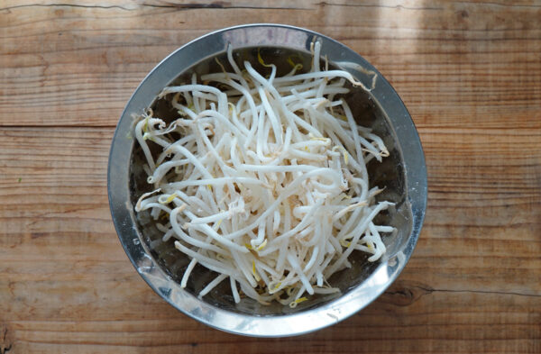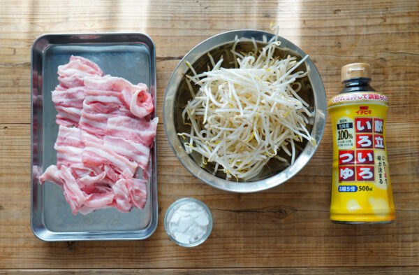 もやしに片栗粉をまぶす。もやしと豚肉をざっくりと3等分する。