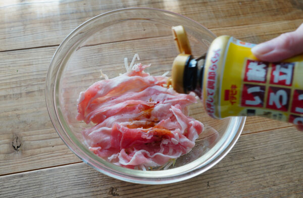 耐熱容器にもやし、豚肉、献立いろいろつゆ(大さじ1)の順に入れていく。これを3回繰り返す。