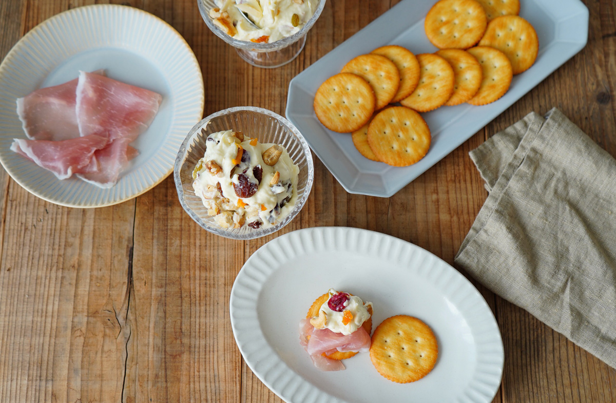 クラッカーに(2)をのせ、お好みで生ハムを添える。