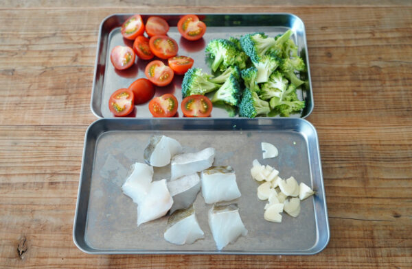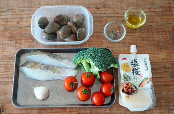 タラは食べやすい大きさに切り、黒こしょうをふる。ミニトマトを半分に切る。ブロッコリーは小房に分ける。にんにくを薄切りにする。