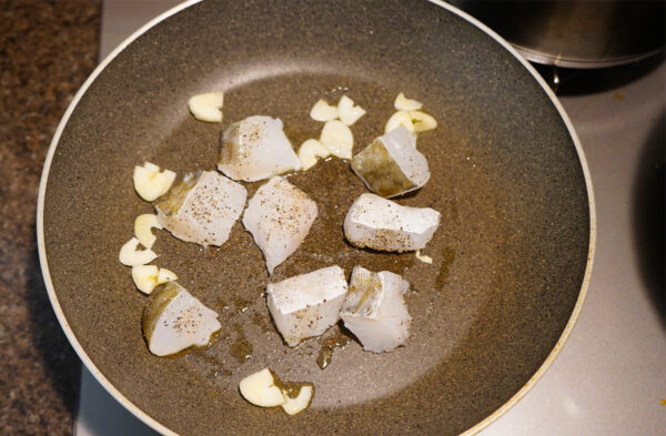 フライパンにオリーブオイルとにんにくを入れて香りが出るまで熱し、タラを加えて表面に軽い焼き色がつくまで焼く。
