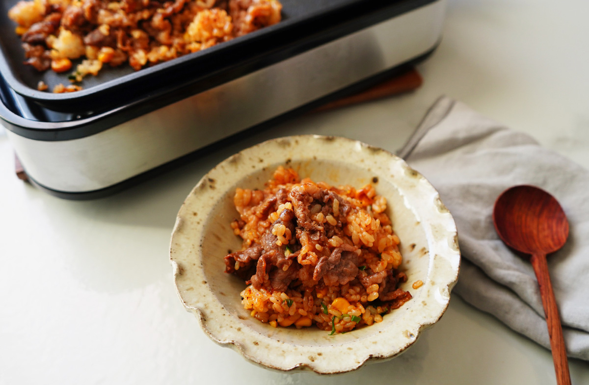 ホットプレートを中温(180℃)に熱してバターを溶かし、中心にご飯をのせる。