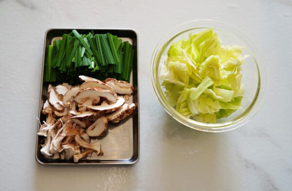 キャベツをざく切りにし、ニラは4cmの長さに切る。しいたけの傘は薄切りにし、軸は手でさく。豚肉は食べやすい大きさに切る。スイートコーンは水気をきっておく。