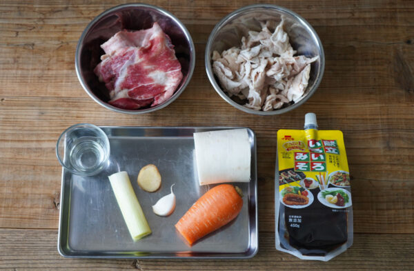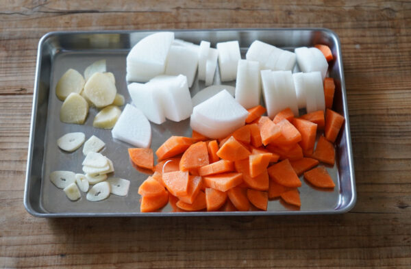 大根とにんじんをいちょう切りにする。にんにくとしょうがを薄切りにする。