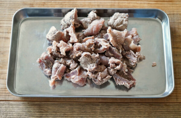 豚モツ、牛スジをザルに上げ、水洗いしてから、3cm大に切る。