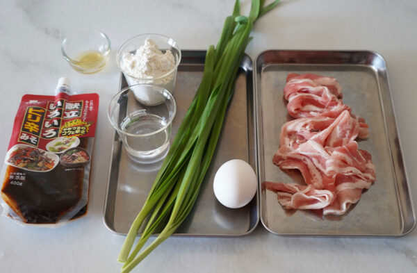 豚肉は幅2cmに切り、にらは長さ4cmに切る。