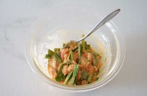 (2)に献立いろいろピリ辛みそを加えて更に混ぜ、豚肉とにらを加えてよく混ぜる。