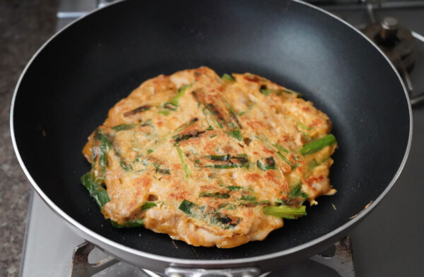 ごま油を熱したフライパンに(3)を入れ、両面きれいな焼き色がつくまで弱めの中火でしっかりと焼く。
