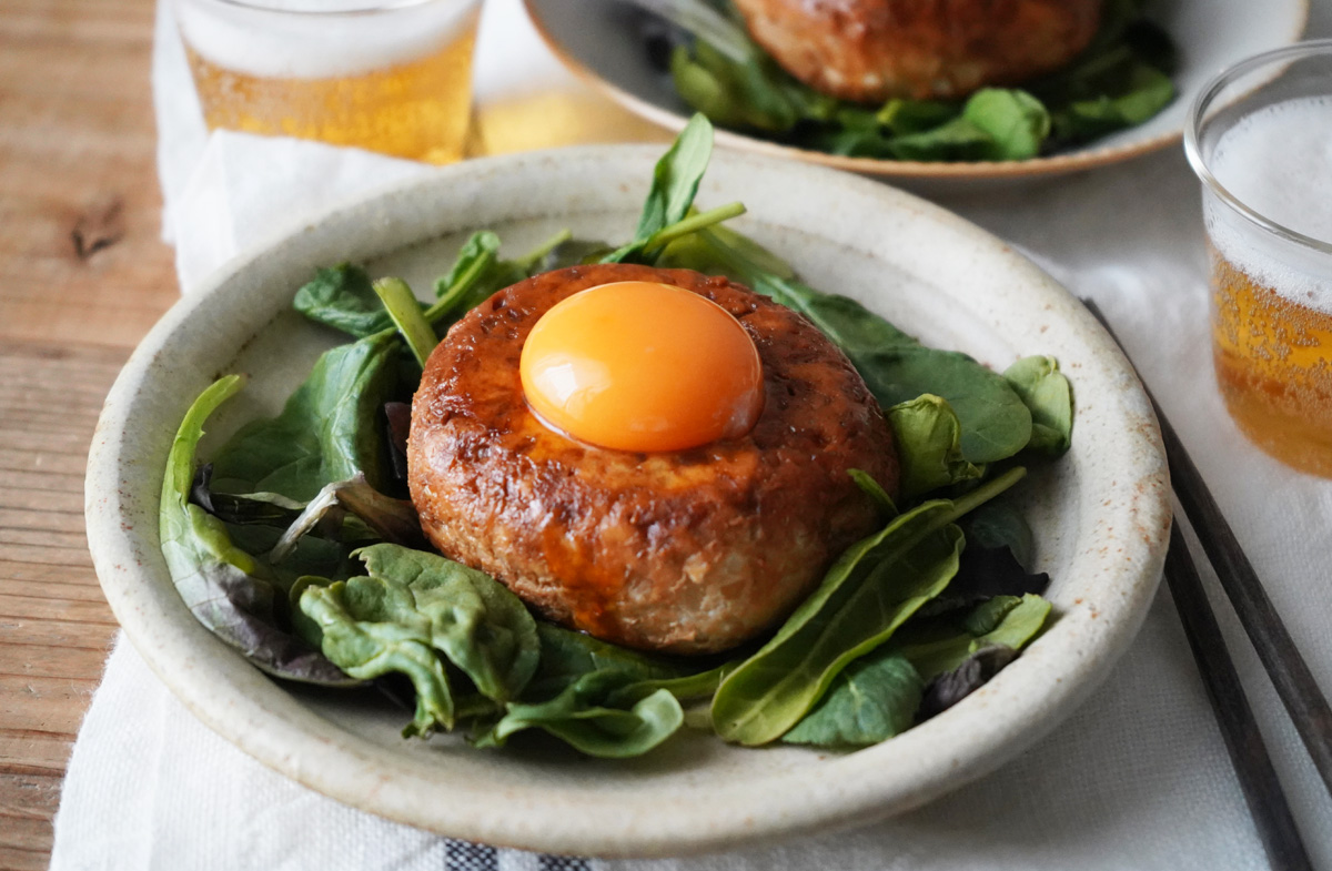 おかずにはもちろん、ビールのおともにもぴったり!ボリューム満点の特大月見つくねです。タネに刻んだれんこんを入れることで、軟骨のようなコリコリとした食感がアクセントになります。卵黄をくずして、つくねに絡めて召し上がれ。
