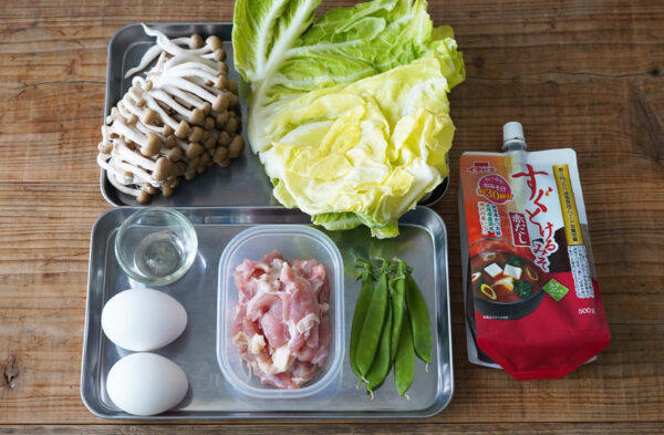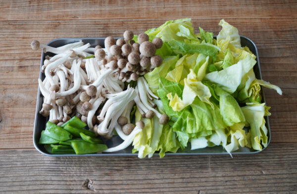 キャベツはざく切りにする。しめじは根元を切ってバラバラにする。絹さやはスジを取って2等分にする。