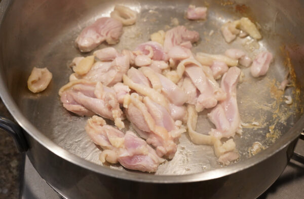 鍋に油を熱し、鶏肉を入れ色が変わるまで炒める。