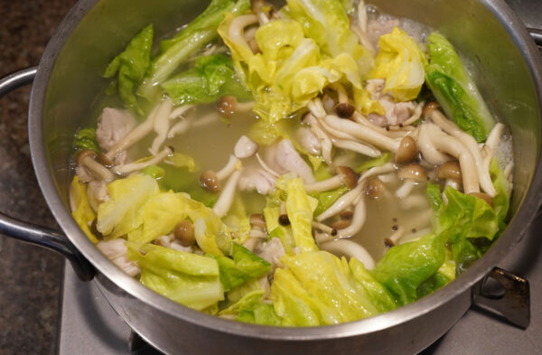 キャベツとしめじを加えてさっと炒め、水500mlを入れて沸騰させる。