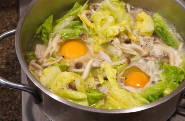 卵を落とし入れ、絹さやを加えて、フタをして弱めの中火でさらに2〜3分煮る。