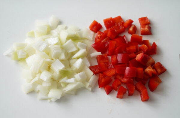 【下味冷凍】パプリカと玉ねぎは1cmの角切りにする。