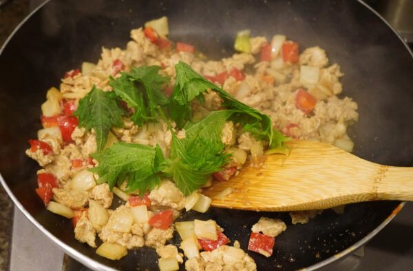 フライパンに油を熱し、(3)を入れ、鶏挽き肉に火が通ったら、大葉をちぎり入れてさっと炒める。