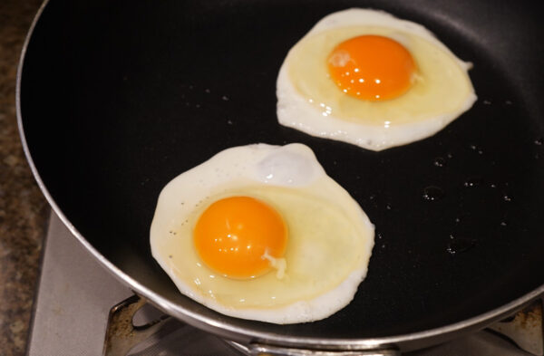 目玉焼きを作る。フライパンに油を熱し、卵を割り入れ、弱めの中火でお好みの固さになるまで加熱する。