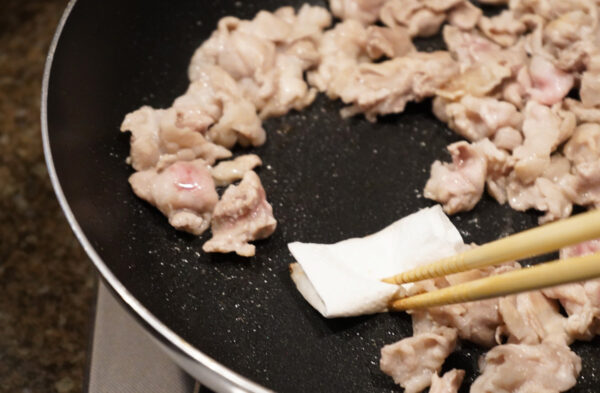 豚バラ肉は油が多いので、フライパンに油を引かずに調理します。加熱時は豚バラ肉から出た余分な油を適宜キッチンペーパーで拭き取ることで献立いろいろつゆの絡みを良くします。