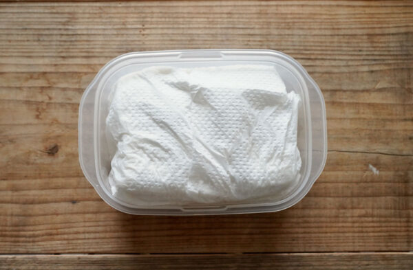 木綿豆腐はキッチンペーパーで包み、冷蔵庫で1時間以上置いて水気を切る。