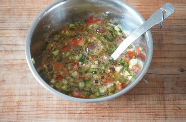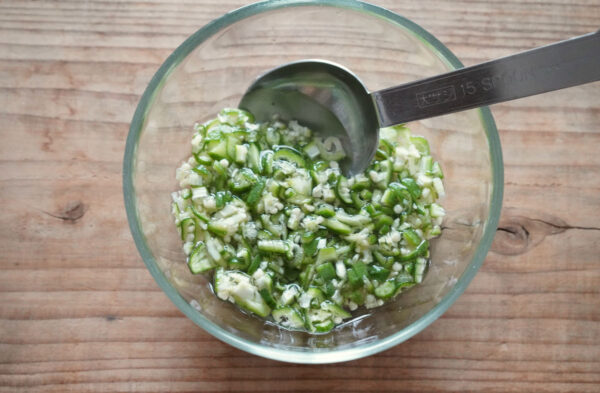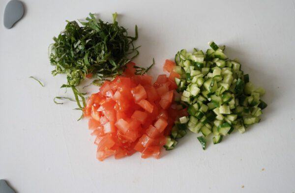 きゅうり、トマトは5〜7mm角に刻む。大葉は千切りにする。