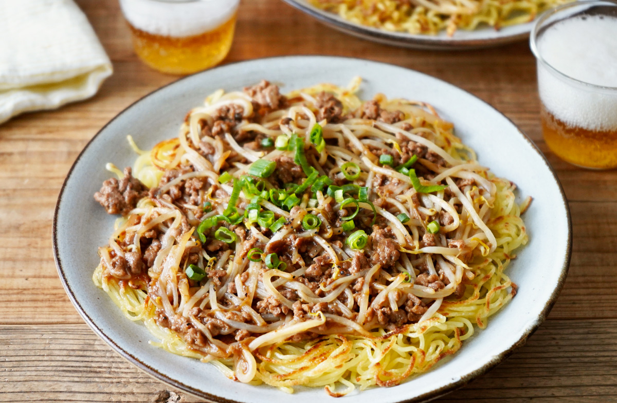価格の安定しているもやし、ひき肉、中華麺を使ったボリューム満点のレシピです。しっかりと味のついたひき肉ともやしが、香ばしいかた焼きそばに絡み、食欲をそそります。フライパン一つで調理が完結するのも嬉しいポイントです。