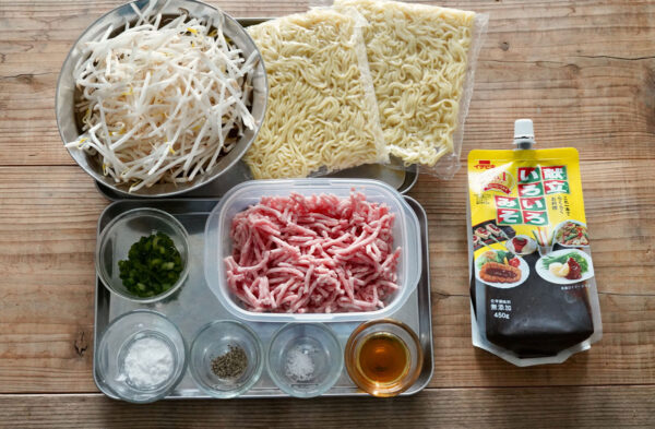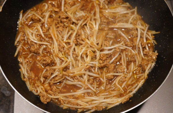 挽き肉の色が変わったら、献立いろいろみそを加えて全体になじませ、もやしを加えて1分程度強火で炒める。