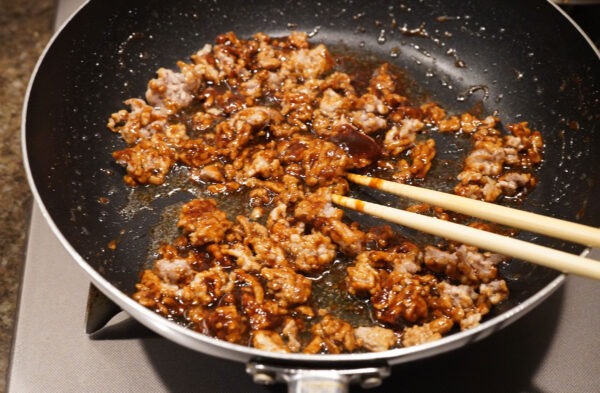 フライパンにごま油を熱し、挽き肉を入れ、塩を振って炒める。