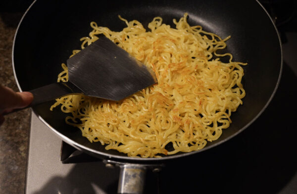 フライパンにごま油を熱し、中華麺を1袋分をのせて平たく焼きつける。裏にも焼き色をつけ、皿に移す。同様にもう1袋分も焼く。