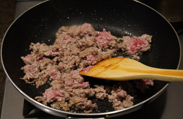 フライパンにごま油を熱し、挽き肉をほぐしながら炒める。