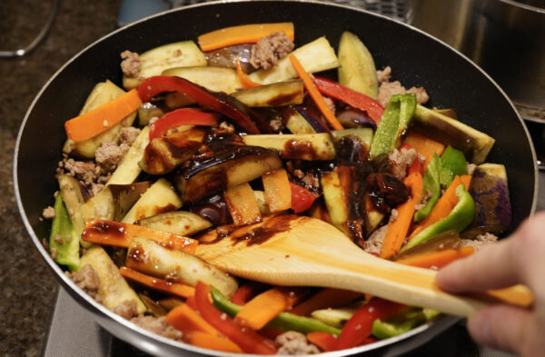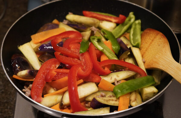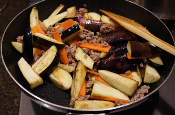 挽き肉の色が変わりはじめたら、にんじんとなすを加える。