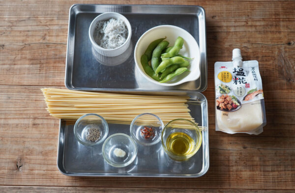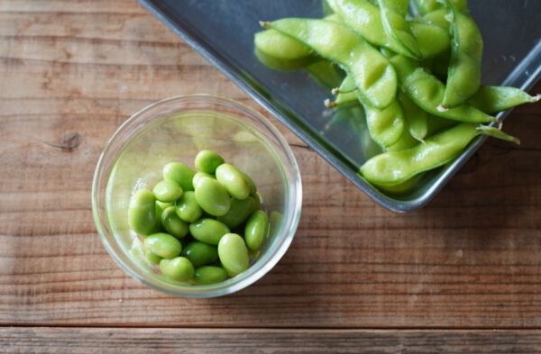 (2)に、オリーブオイル、シラス、枝豆を加えてしっかりと混ぜ、皿に盛る。